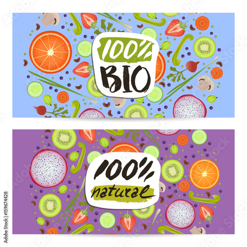 Organic Food Horizontal Flyers Set Vector Illustration Vegetarian Gmo Free Fresh And Natural Vegan Raw Food Gluten Free Healthy Lifestyle Bio And Eco Nutrition Concept Fruits And Vegetables Buy This Stock - Focus On Nourishing Your Body.