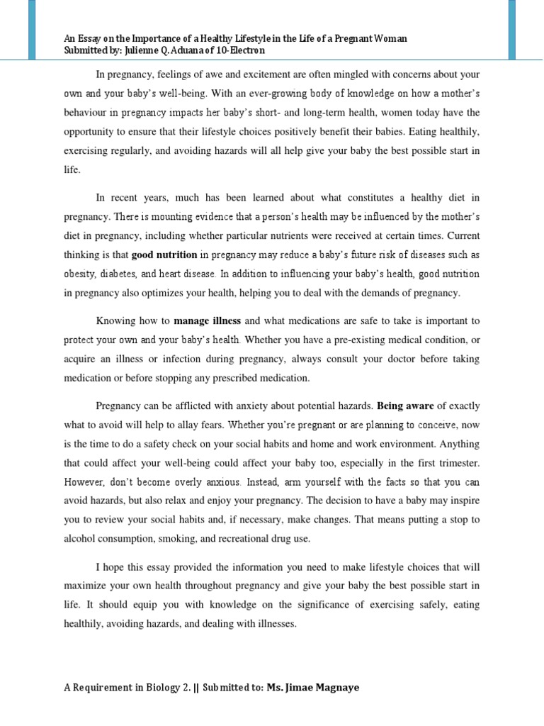 An Essay On The Importance Of A Healthy Lifestyle In The Life Of A Pregnant Woman Submitted By Julienne Q Aduana Of 10 Electron Pregnancy Anxiety , A Healthy Lifestyle Undoubtedly Gives A Magical Touch To Your Life.